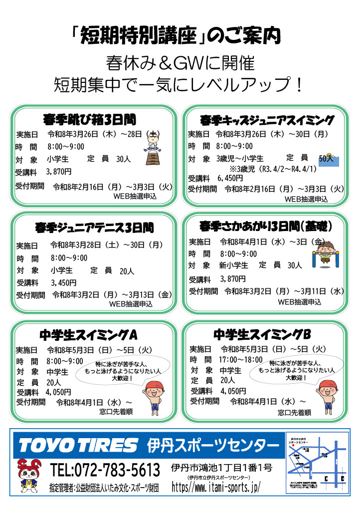 | 春季キッズジュニアスイミング | 令和8年3月26日(木)~30日(月) | 8:00~9:00 | 3歳児~小学生 | 50名 | 6,450円 | 受付中 | 窓口 |