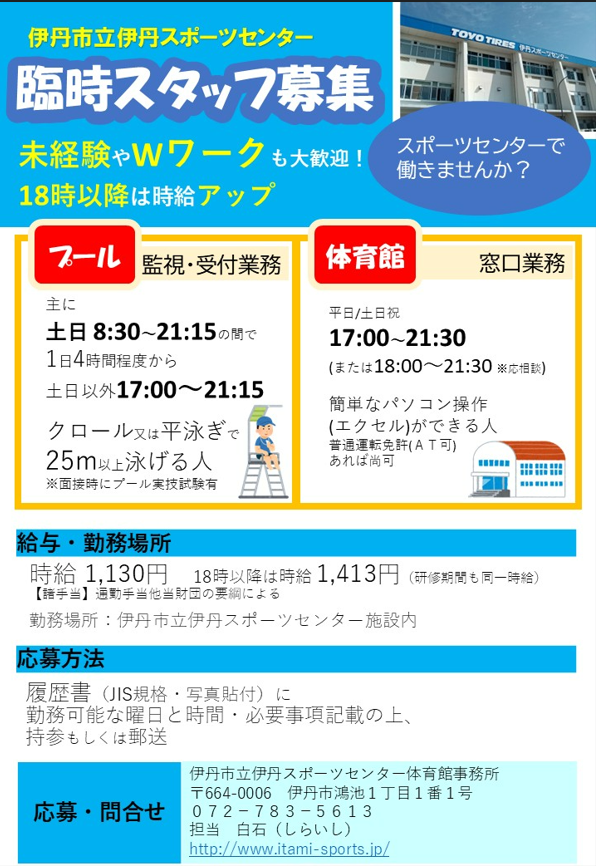 TOYO TIRES 伊丹スポーツセンターではアルバイトスタッフを募集しております。ご応募お待ちしております。