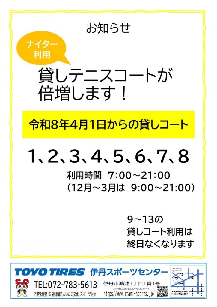 2026.02.28 トピックス テニスコート利用区分、変更のお知らせ 令和8年4月より、一般利用(レンタル)コートを変更いたします。18時以降のナイターでの利用コートが増えました。是非ご利用ください。 <一般利用コート>1番コートから8番コート <定期使用コート>9番コートから13番コート
