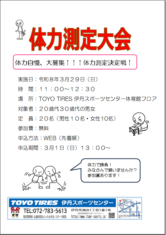 実施日 : 令和8年3月29日(日)                                              時 間 : 11:00~12:30                                                  場 所 : TOYO TIRES 伊丹スポーツセンター体育館フロア                                   対象者 : 20歳代 30歳代                                                定 員 : 20名(男性10名・女性10名)                                            参加費 : 無料                                                      申込方法: WEB(先着順)                                                申込期間: 3月1日(日)13:00~