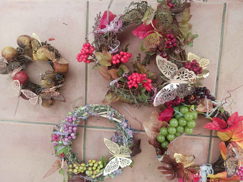 春と秋にリースを作ります。春にはミモザで春らしく。秋のリース、ローズマリーや姫リンゴは本物を使って、あとは100円均一のお店で材料を購入して作りました。今年の秋はみじかいようですね。暑かったと思っていたら、もう寒いです。気分だけでも秋を楽しみたいです。