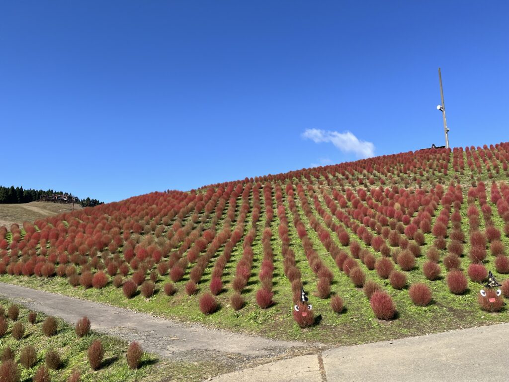 秋のよく晴れた日!緑から赤へ。そして真っ赤、最後には赤から金色へと変化するコキア。ふわふわとした可愛らしい見た目のコキアと青い空とのコントラストがとてもきれいな一枚でした~