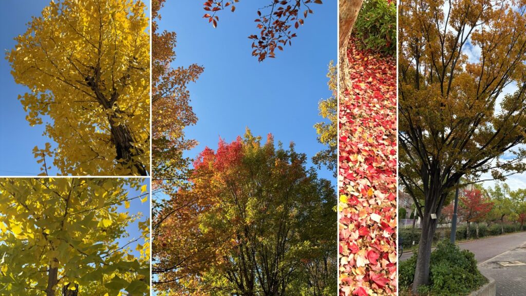 紅い葉、黄色い葉などスポーツセンター施設内を歩いているだけでも目の保養になる季節ですね。昔はモミジにばかりに気が向いていましたが、だんだんと色々な木々の色々な色を楽しむようになりました。私の家の近所にイチョウ並木っぽい道があり道の両脇が黄色に彩られる景色はとてもキレイです。この数年はこの黄色とまだ色づいていない緑の葉のグラデーションも美しいなと思うようになりました。落ち葉もフカフカの秋のじゅうたんといった感じで好きです(お掃除は大変ですが)。